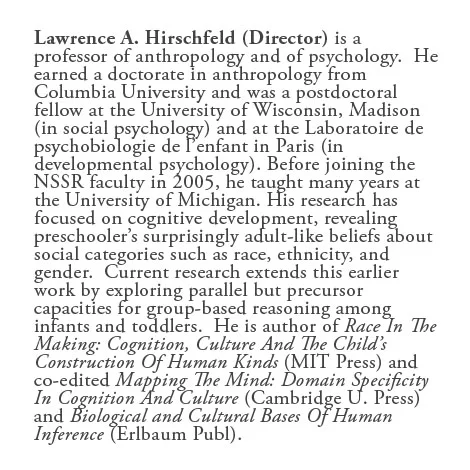 The Lab Director. Lawrence Hirschfeld is a professor of anthropology and of psychology. He received his doctorate in anthropology from Columbia University and was a postdoctoral fellow at the University of Wisconsin, Madison in Social Psychology and at the Laboratoire de psychobiologie de l’enfant in Paris in Developmental Psychology. Before joining the NSSR faculty in 2005, he taught many years at the University of Michigan. His research has focused on cognitive development, revealing preschoolers’ surprisingly adult-like beliefs about social categories such as race, ethnicity, and gender. Current research extends this earlier work by exploring parallel but precursor capacities for group-based reasoning among infants and toddlers. He is author of Race in The Making: Cognition, Culture and The Child’s Construction of Human Kinds (MIT Press) and co-edited Mapping The Mind: Domain Specifity In Cognition and Culture (Cambridge U. Press) and Biological and Cultural Bases of Human Inference (Erbaum Publ.)