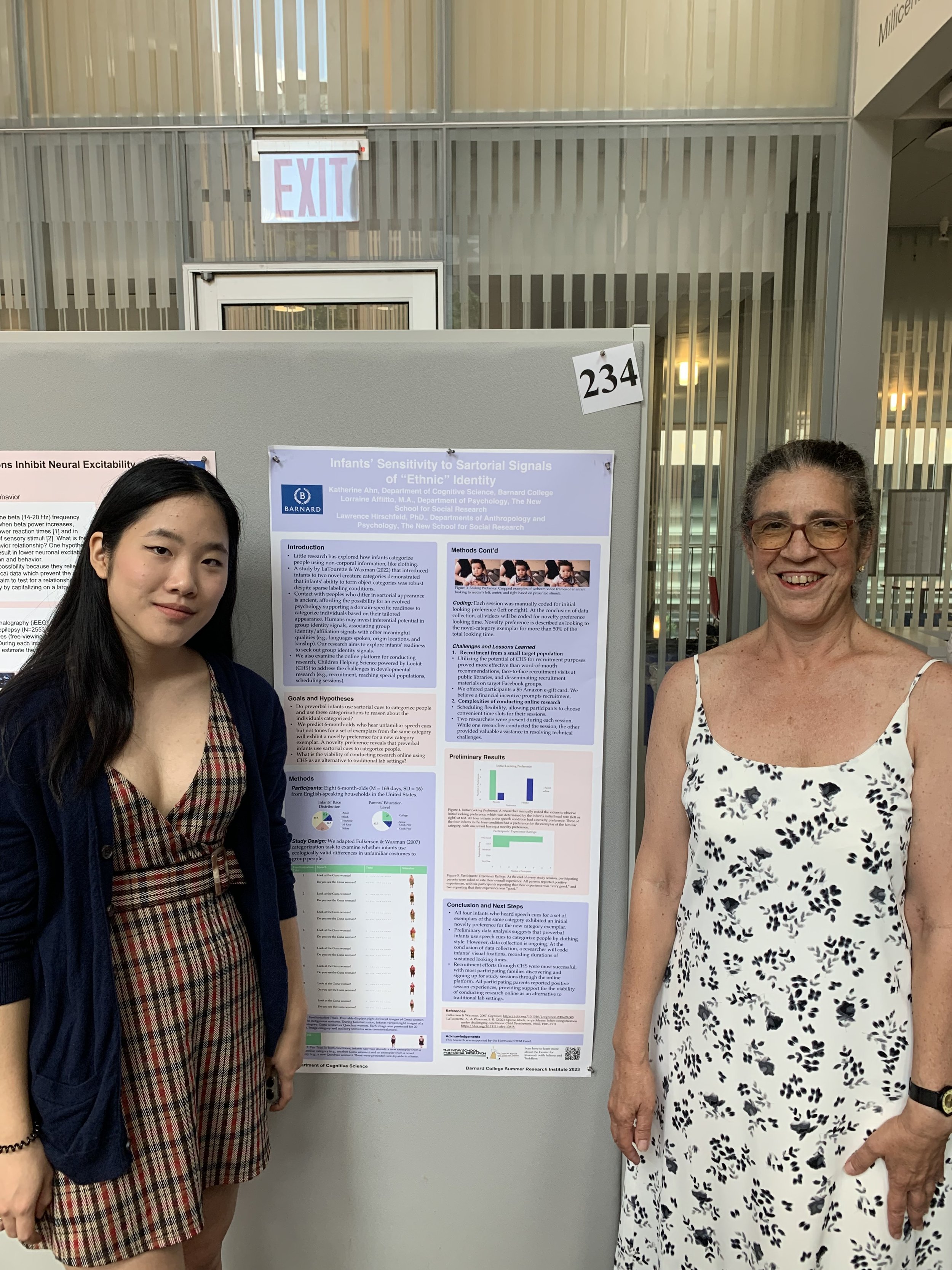 Experiment 2: Infants aged 6 months are presented with picture of adults wearing traditional clothing and hear samples of an unfamiliar language. Then they will be presented with pictures of other adults wearing traditional clothing and hear a new sample of the unfamiliar language and a sample of a second unfamiliar language. Finally, they will then be presented with an adult wearing traditional clothing from a new society and hear speech samples in both languages. We want to know whether the child will look longer at some pairings more than the others.